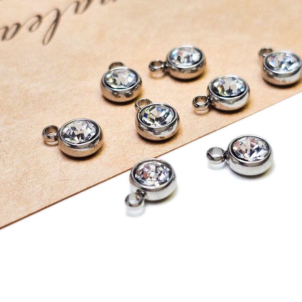 透明なラインストーンを丸いシルバーのパーツで止めています。